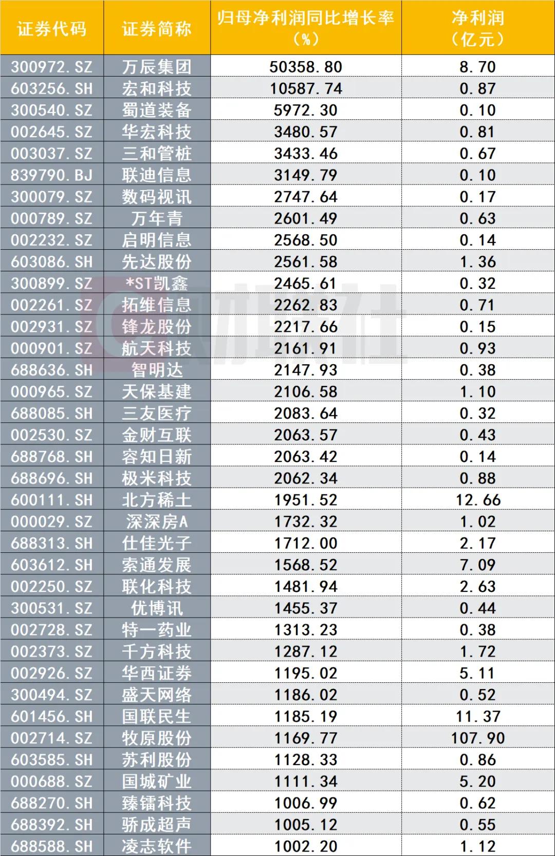 值得一提的是,箝制当今,A股已有超30家公司半年报净利润同比增长逾10倍。其中,本年半年报获利最好者当属万辰集团,净利润8.7亿元,同比翻了逾500倍。在半年报净利润同比增速达10倍以上的公司中,净利润金额率先10亿元的有牧原股份(107.9亿元)、朔方稀土(12.66亿元)、国联民生(11.37亿元)。